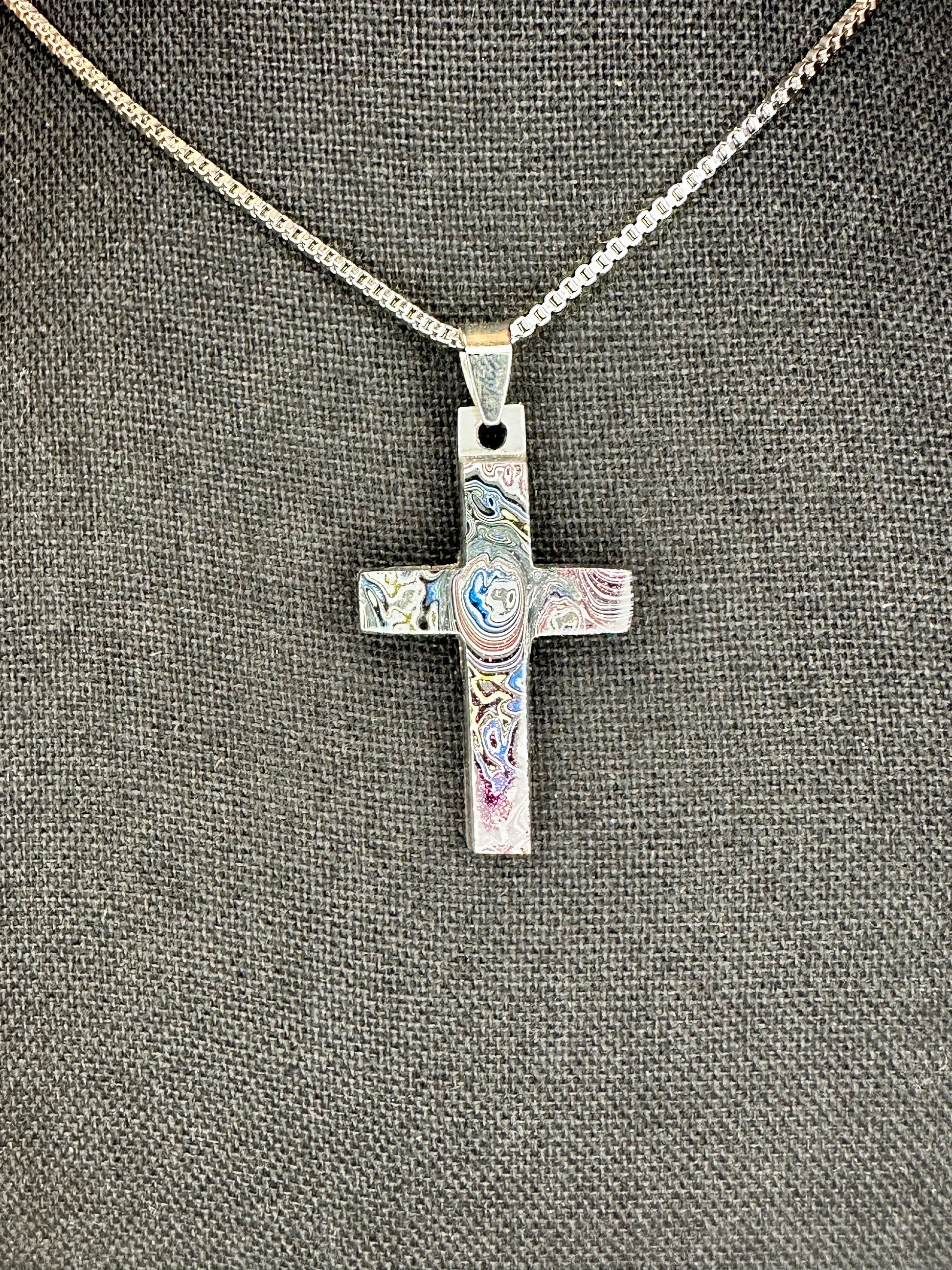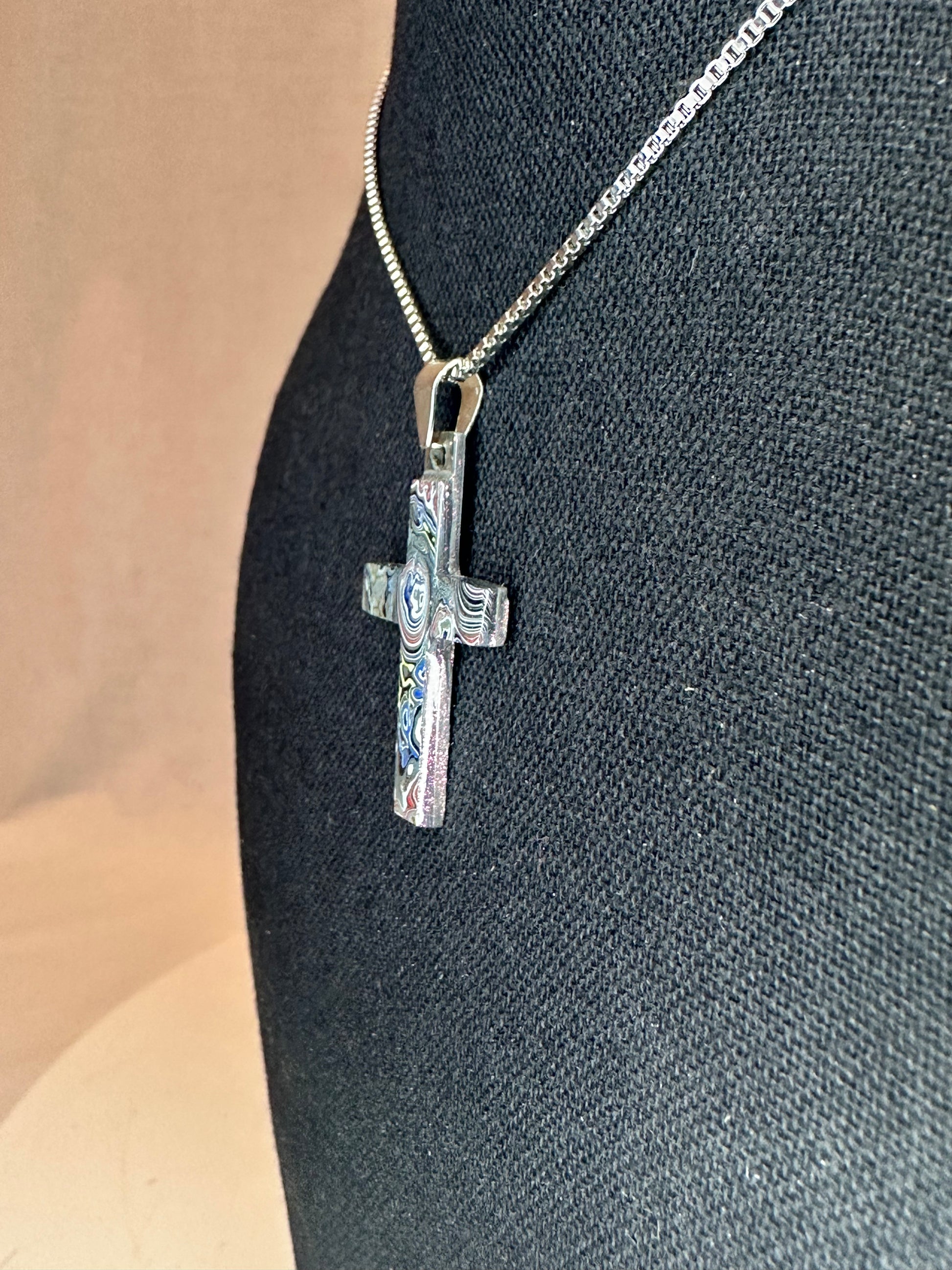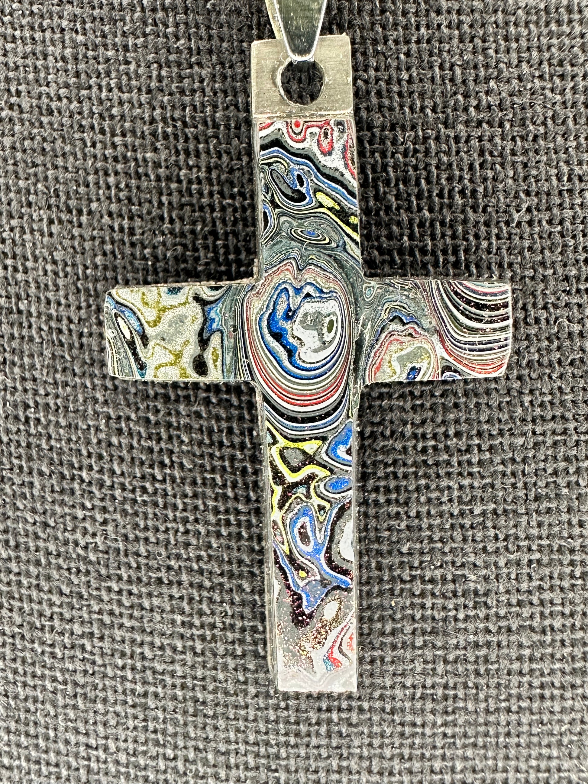 Each cross is handmade in Fort Worth, Texas. Sanded and polished to reveal the specific color bands you see here. Chosen for their texture, balance, and beauty.