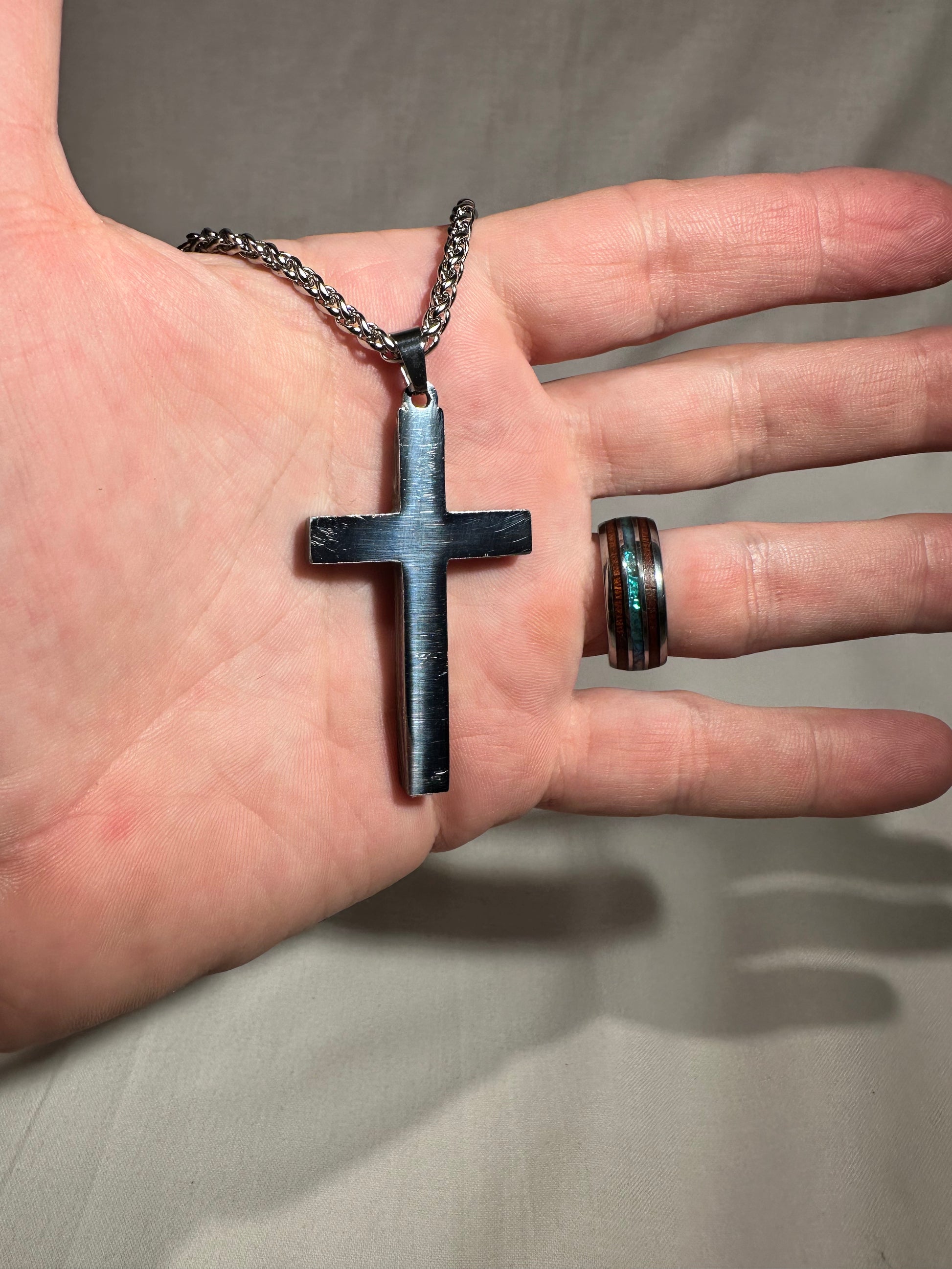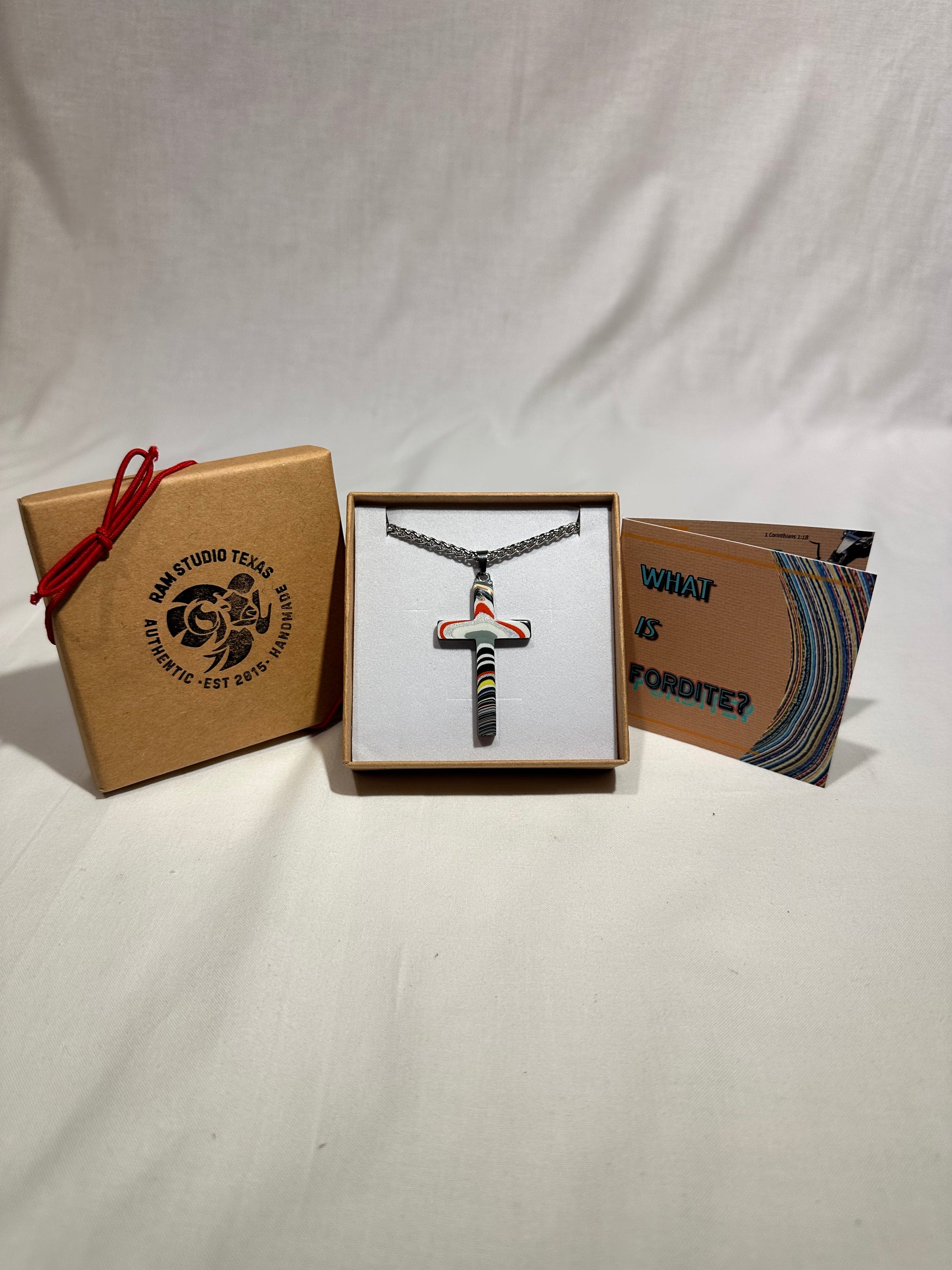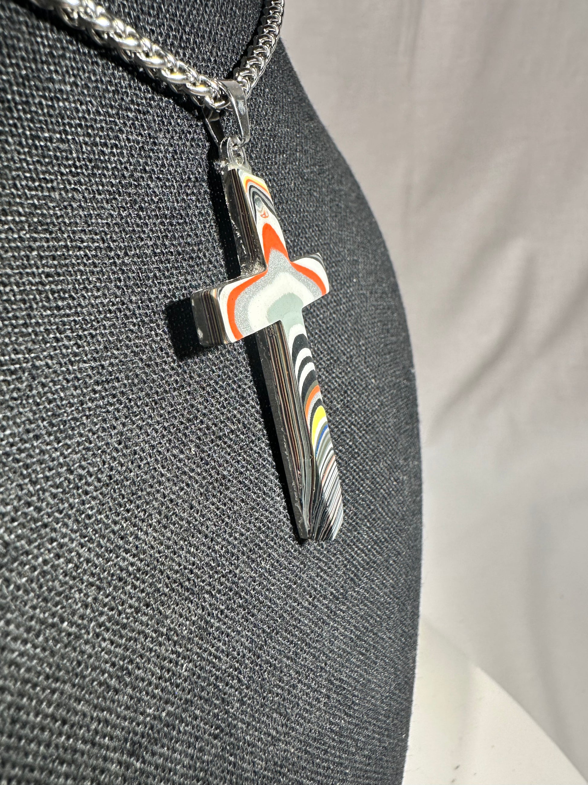 Each cross is handmade in Fort Worth, Texas. Sanded and polished to reveal the specific color bands you see here. Chosen for their texture, balance, and beauty.