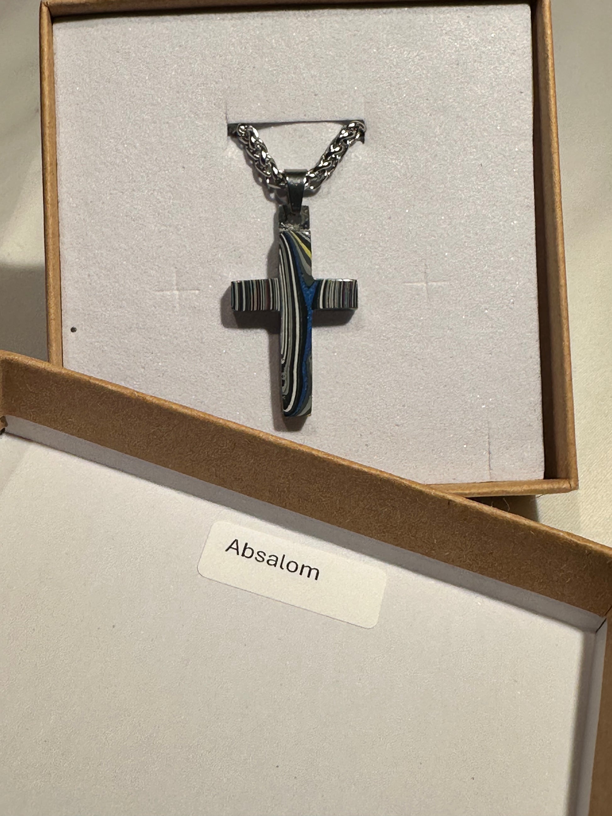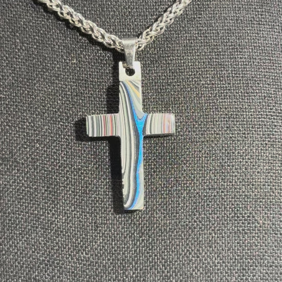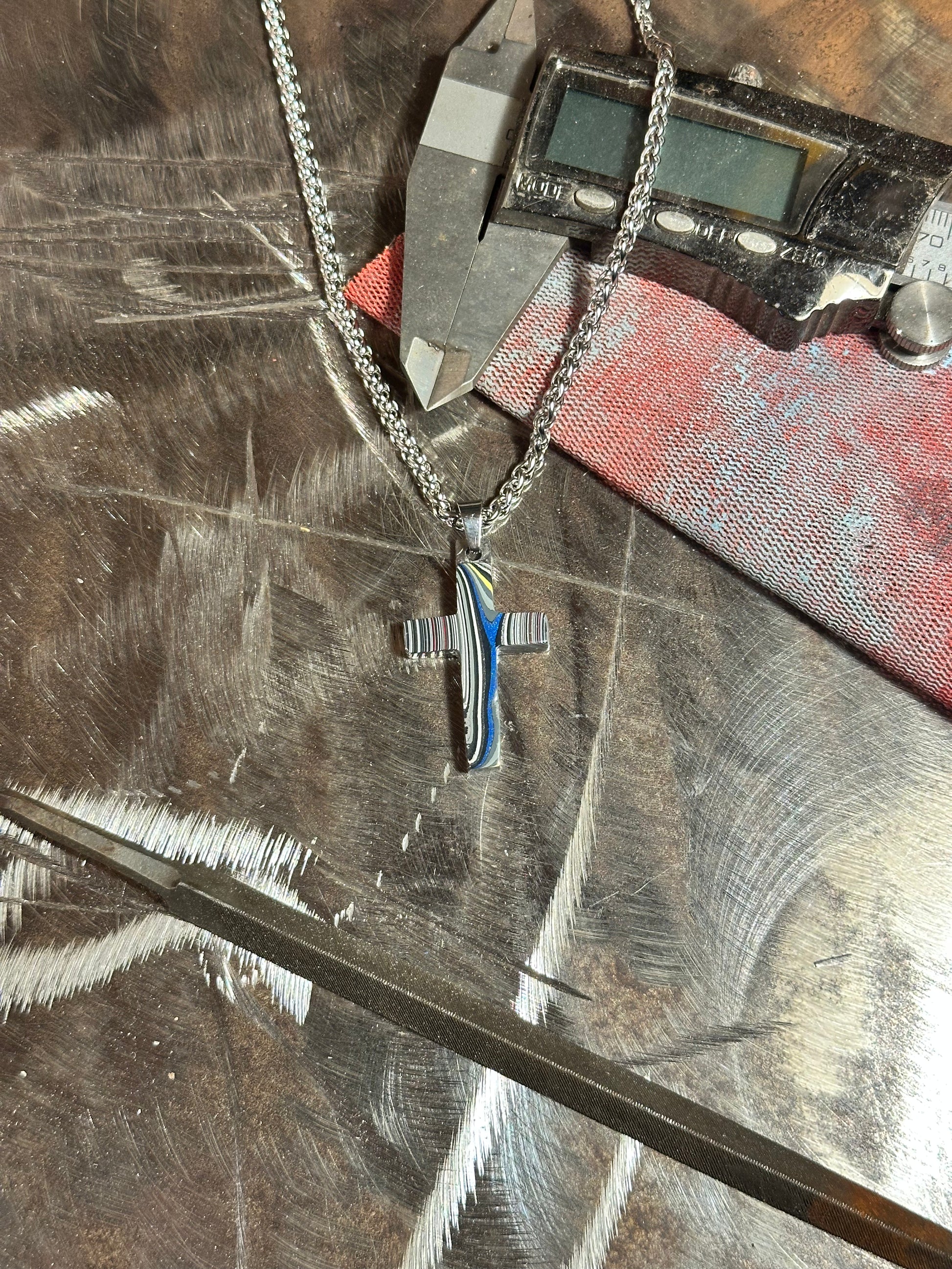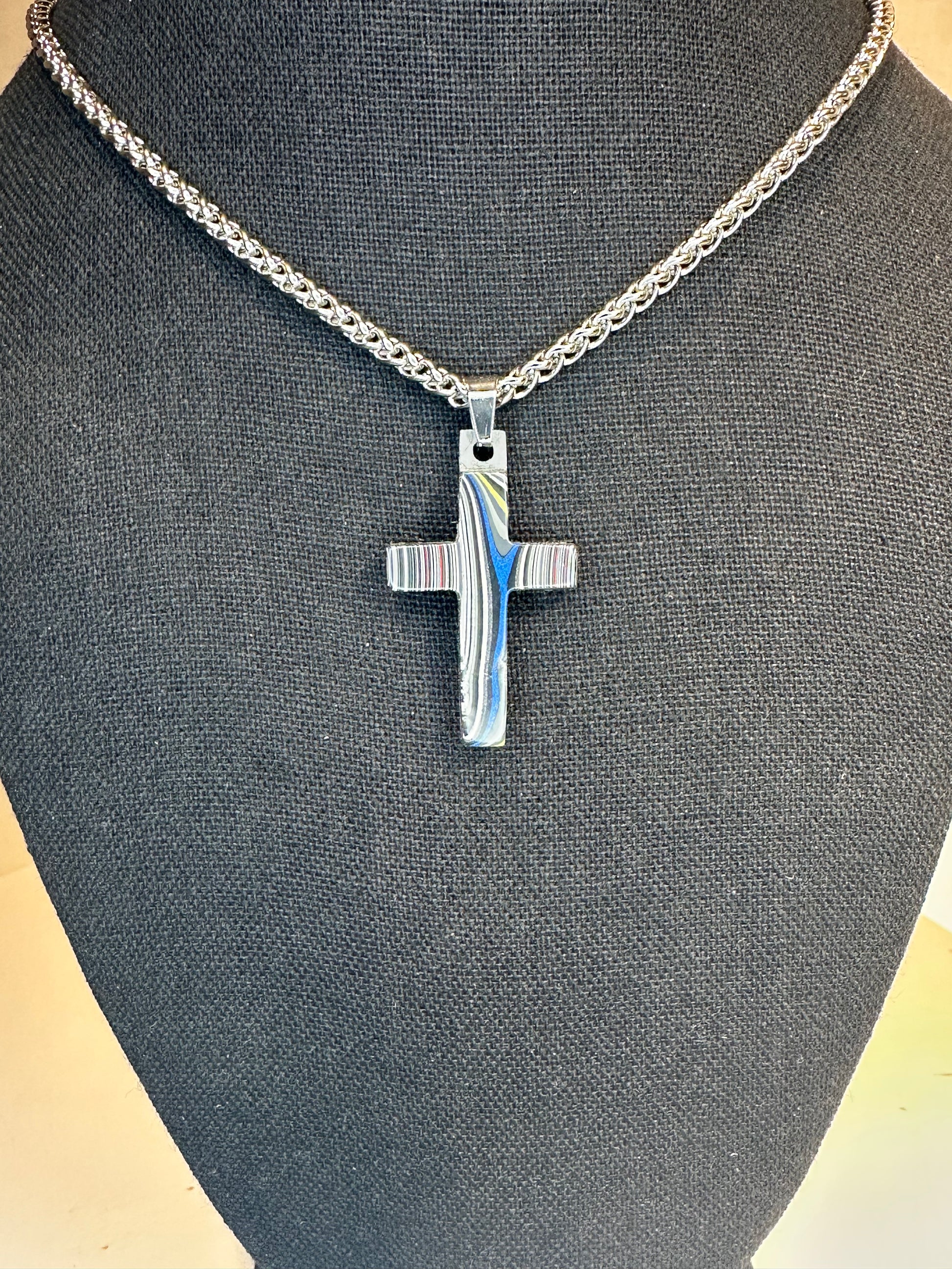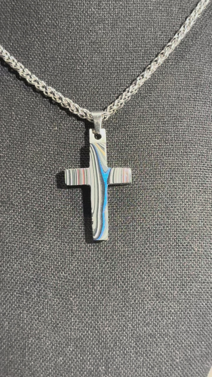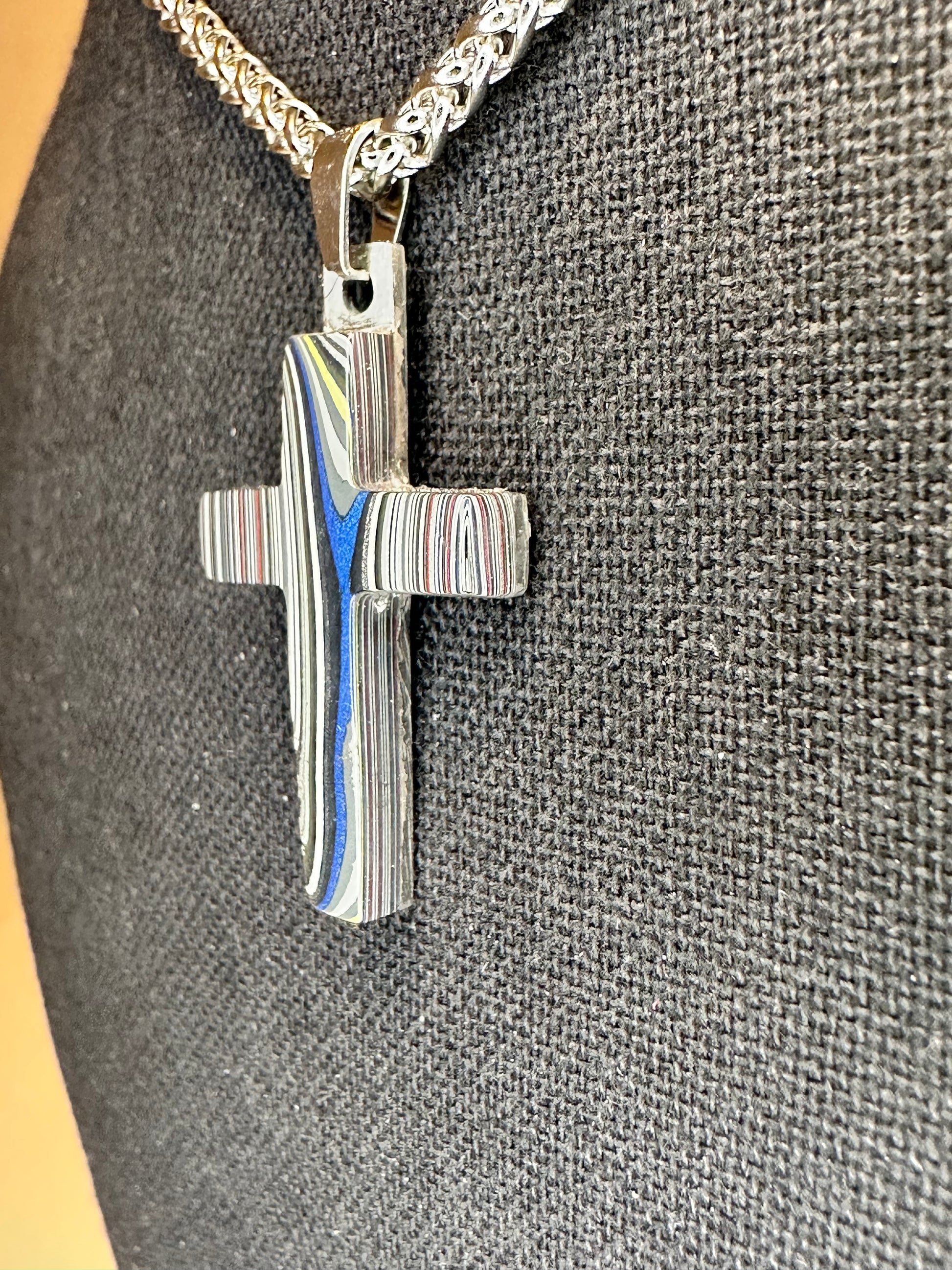 Each cross is handmade in Fort Worth, Texas. Sanded and polished to reveal the specific color bands you see here. Chosen for their texture, balance, and beauty.