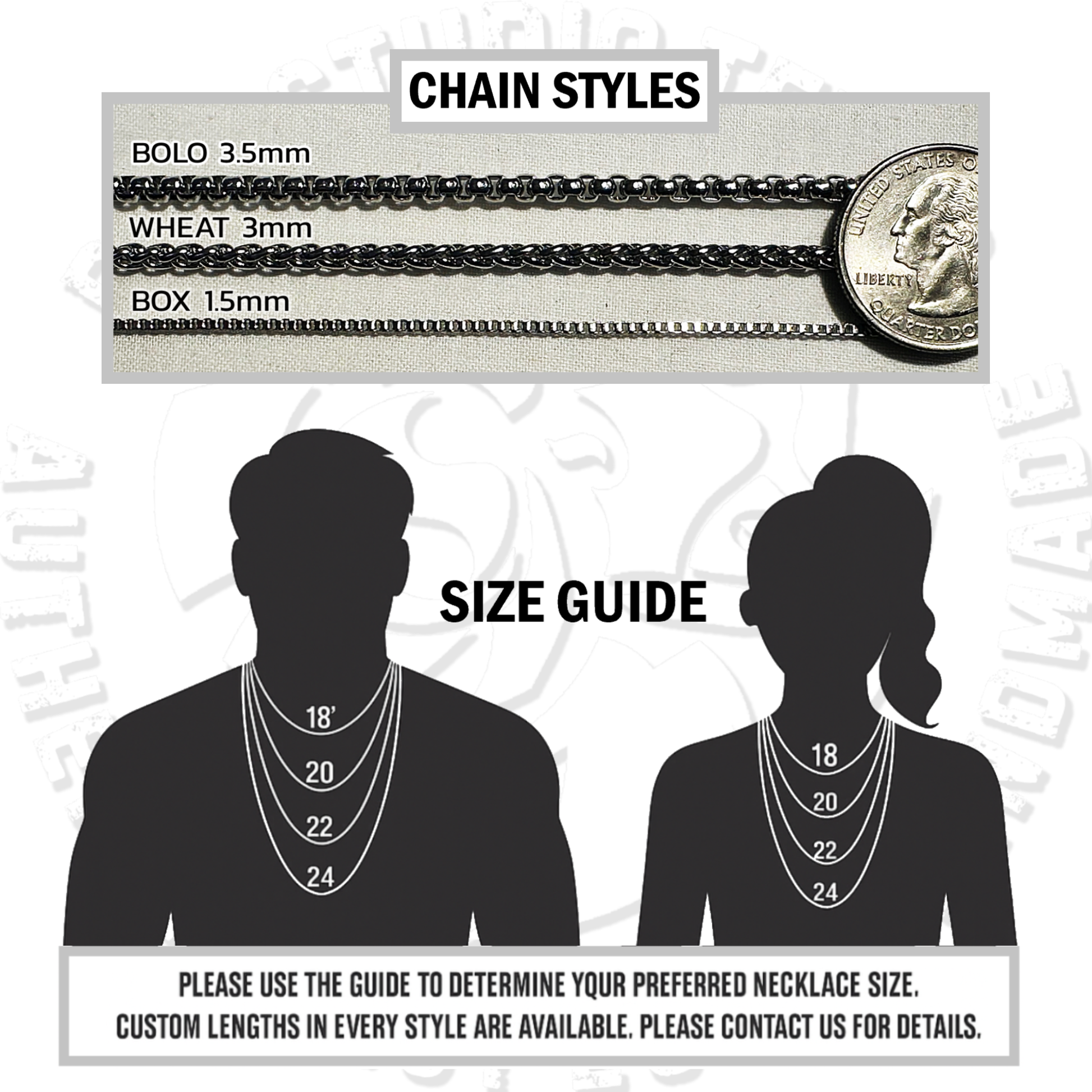 Choose your preferred chain type and length from the dropdowns to the right. Pick what you like stress free! All options are included at no additional cost. All chains are 304L stainless steel or better. (See last image for style and length guide.)