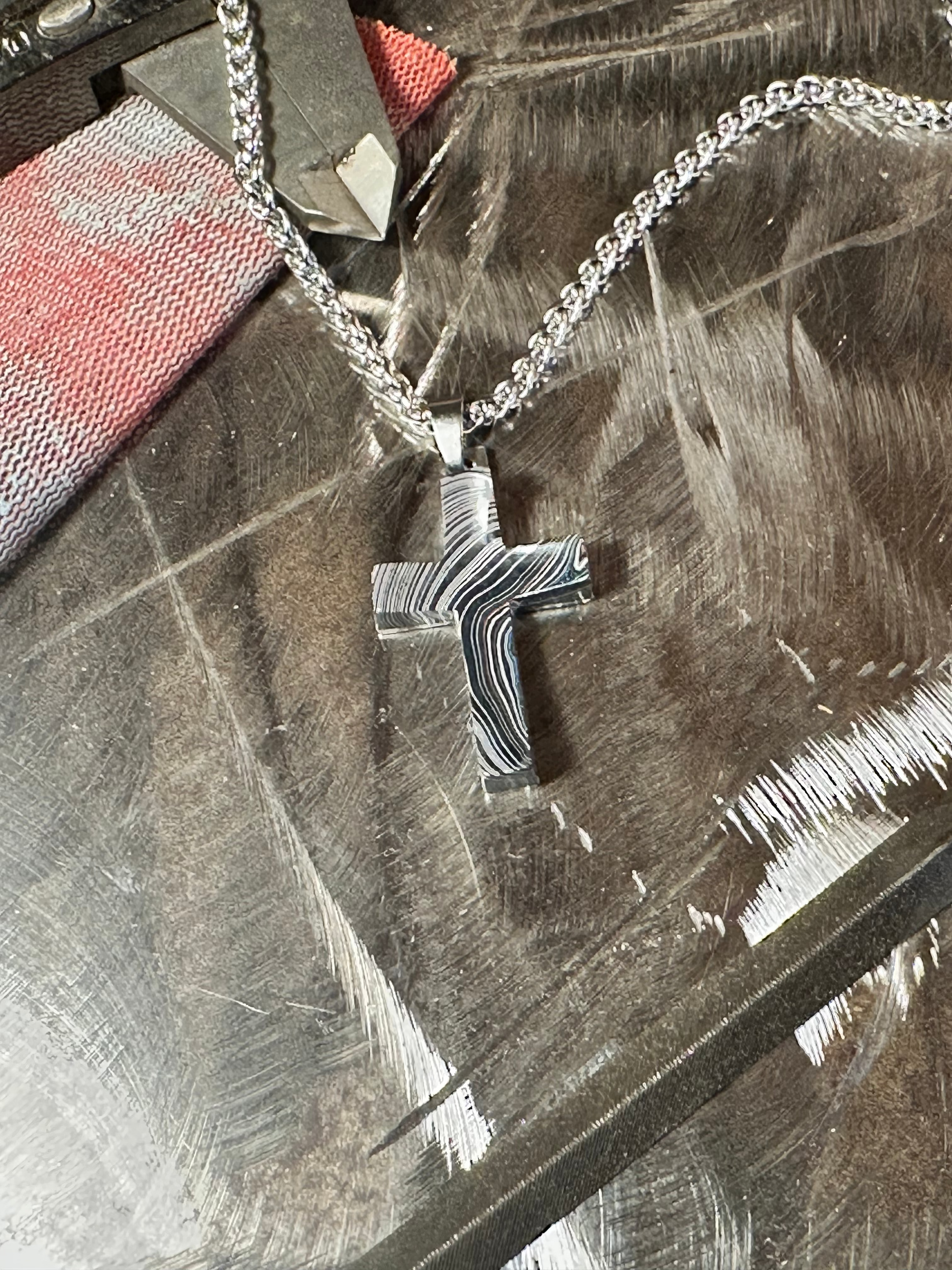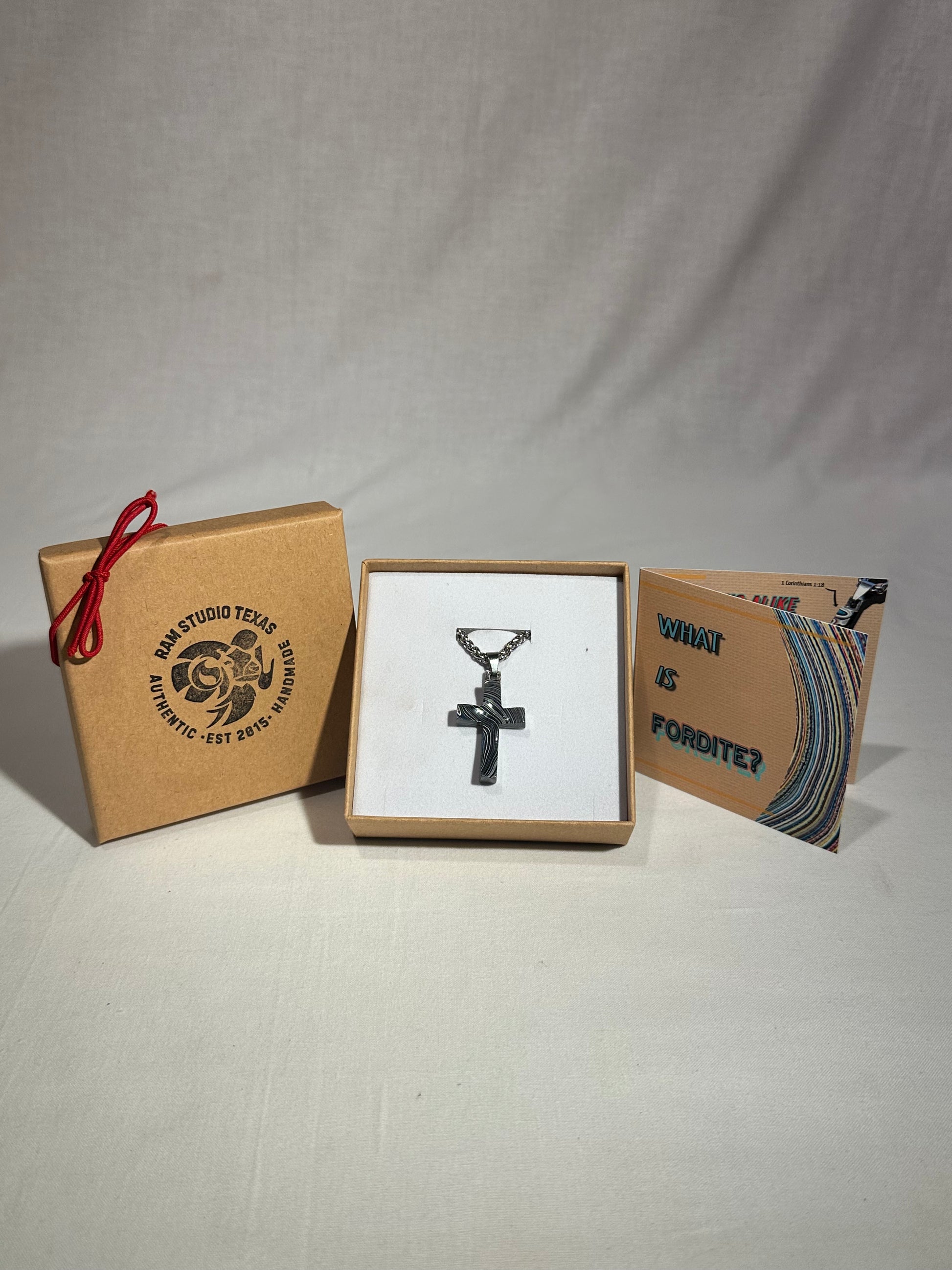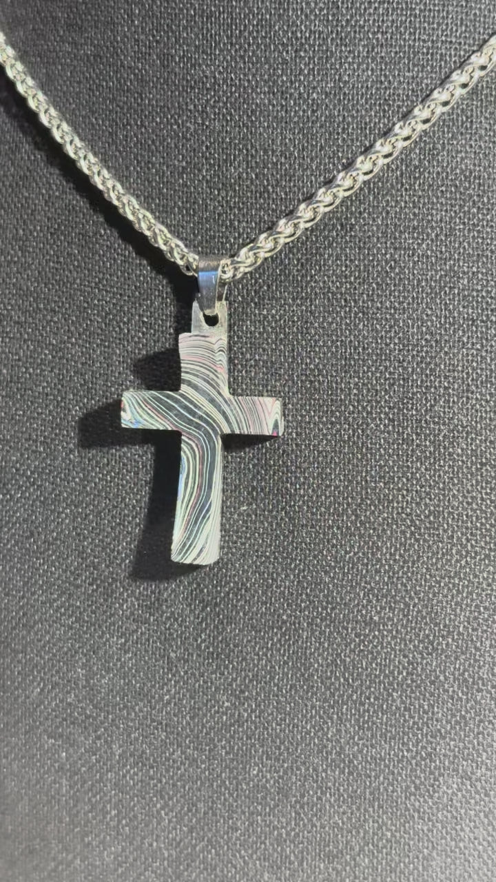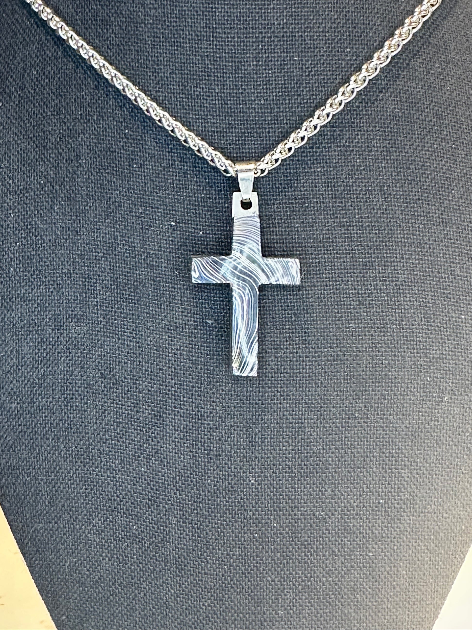 Each cross is handmade in Fort Worth, Texas. Sanded and polished to reveal the specific color bands you see here. Chosen for their texture, balance, and beauty.