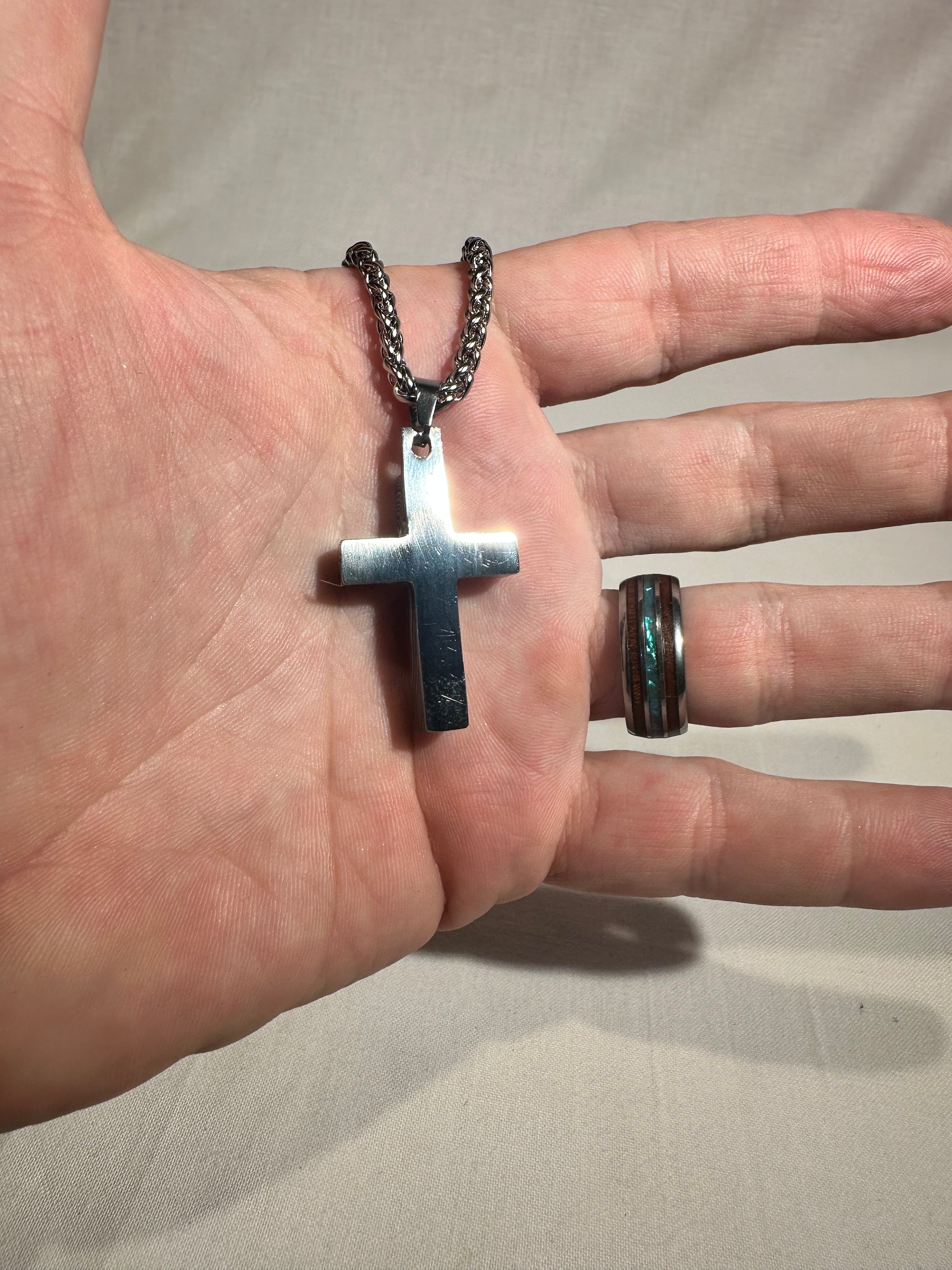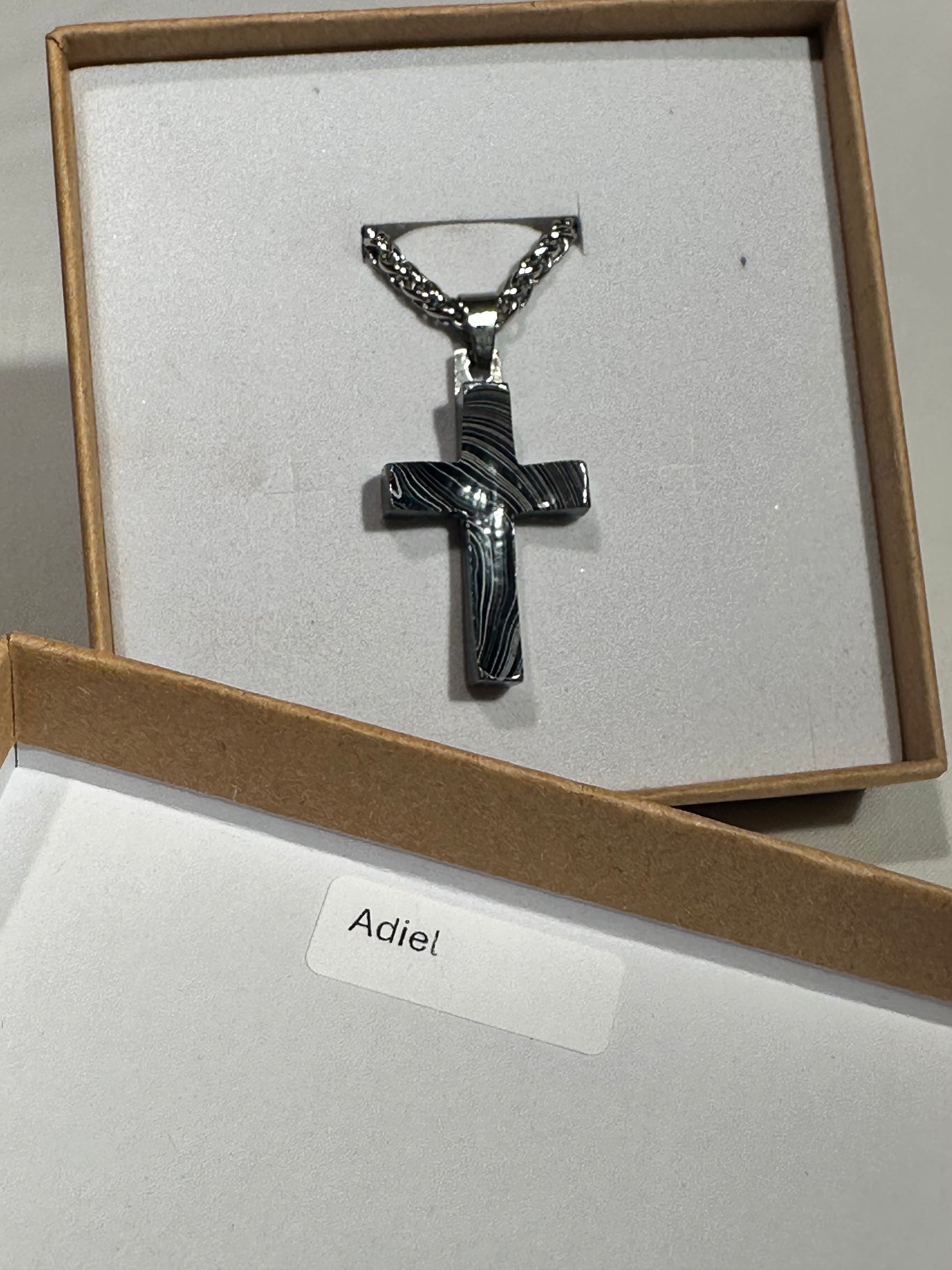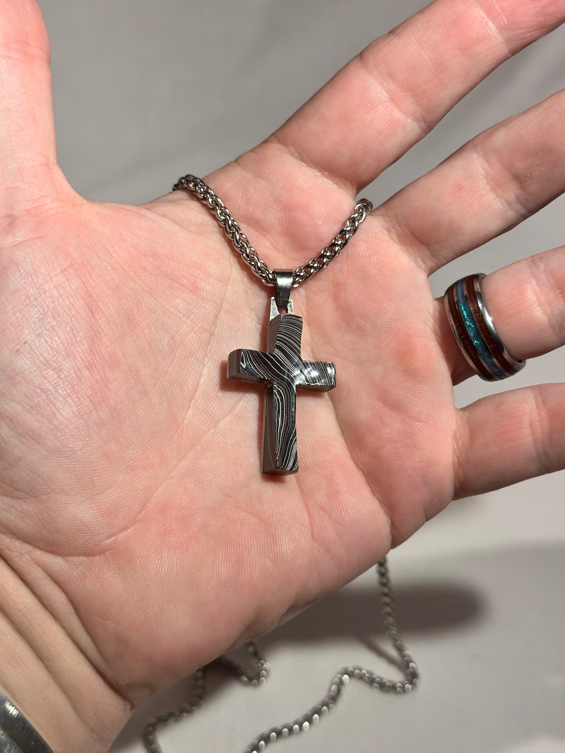 Each cross is handmade in Fort Worth, Texas. Sanded and polished to reveal the specific color bands you see here. Chosen for their texture, balance, and beauty.