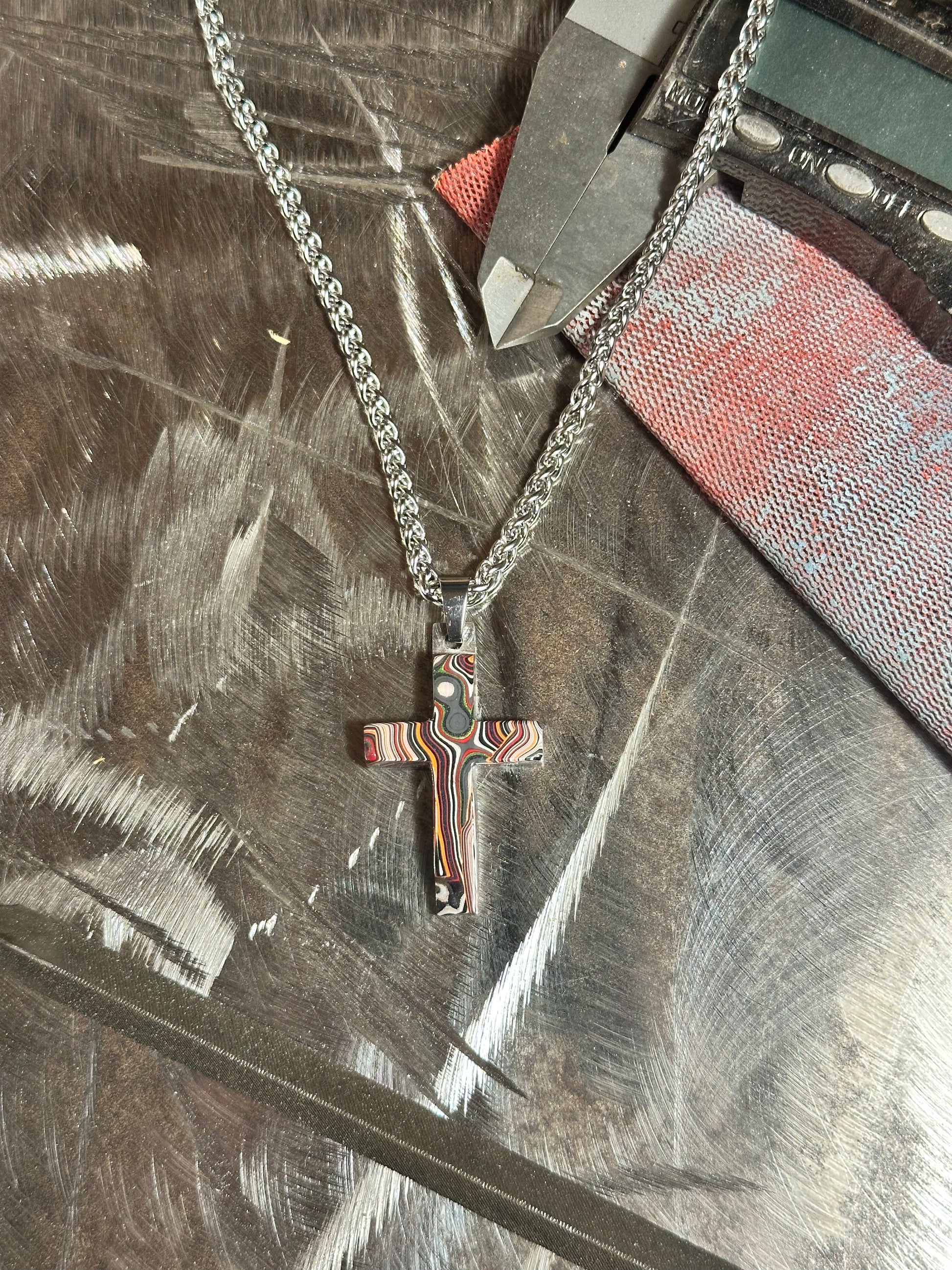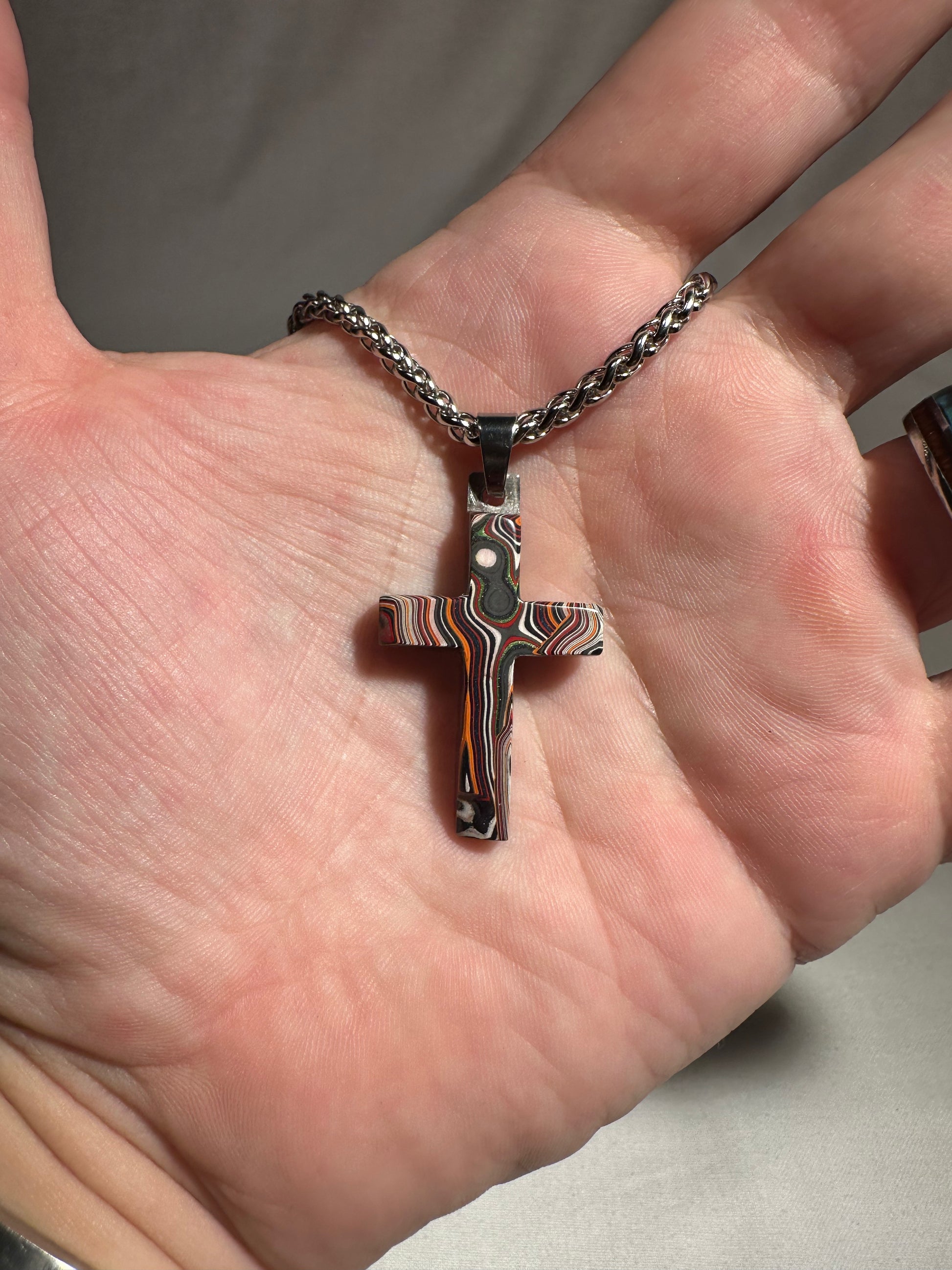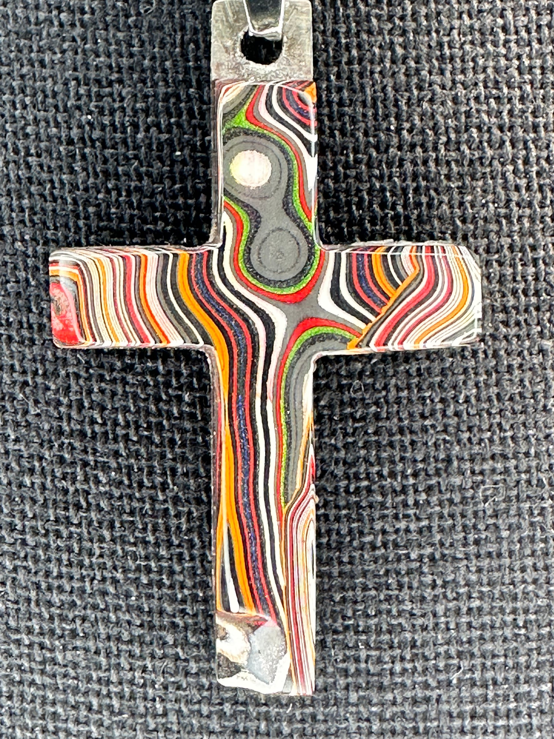 Each cross is handmade in Fort Worth, Texas. Sanded and polished to reveal the specific color bands you see here. Chosen for their texture, balance, and beauty.