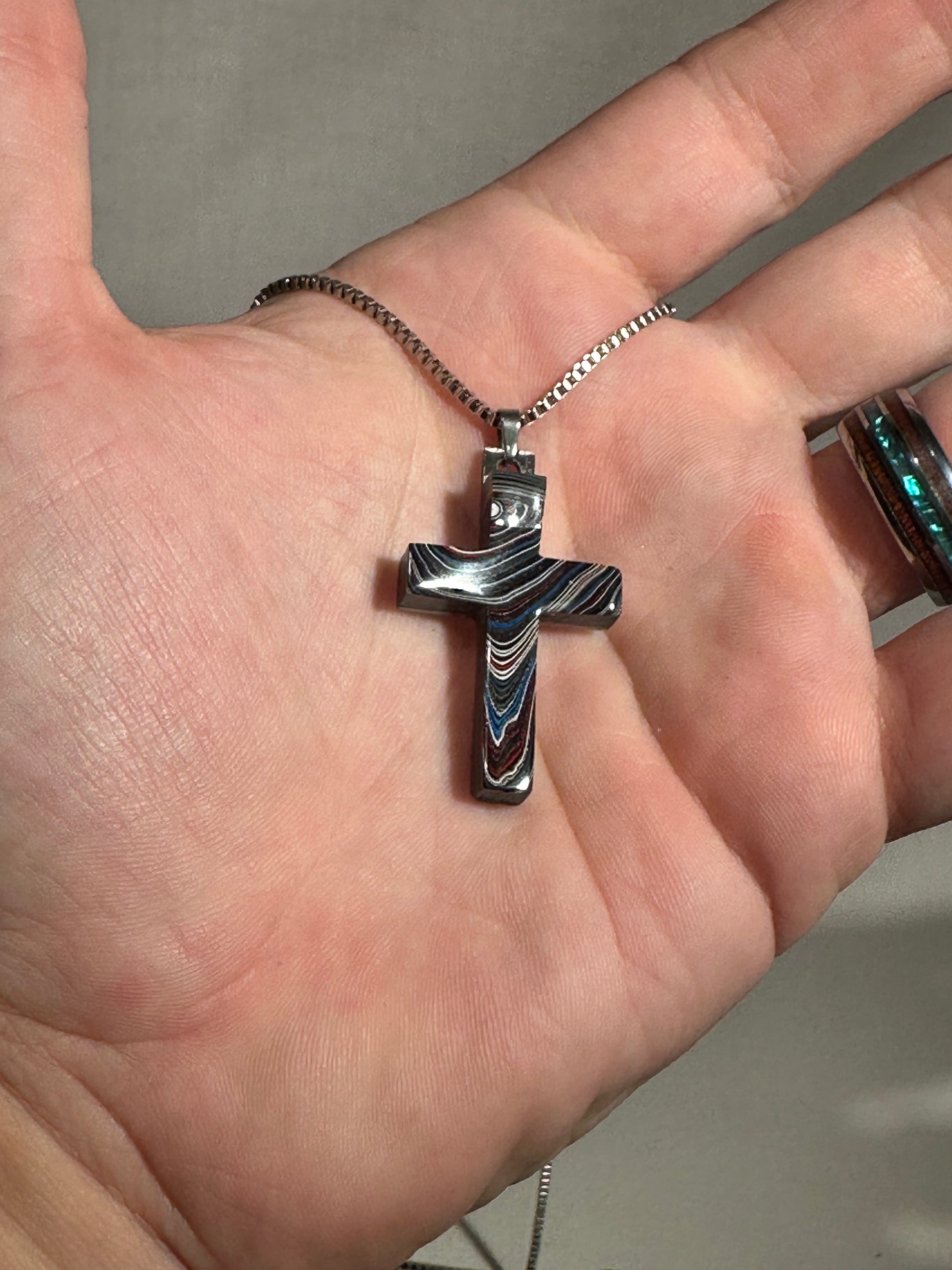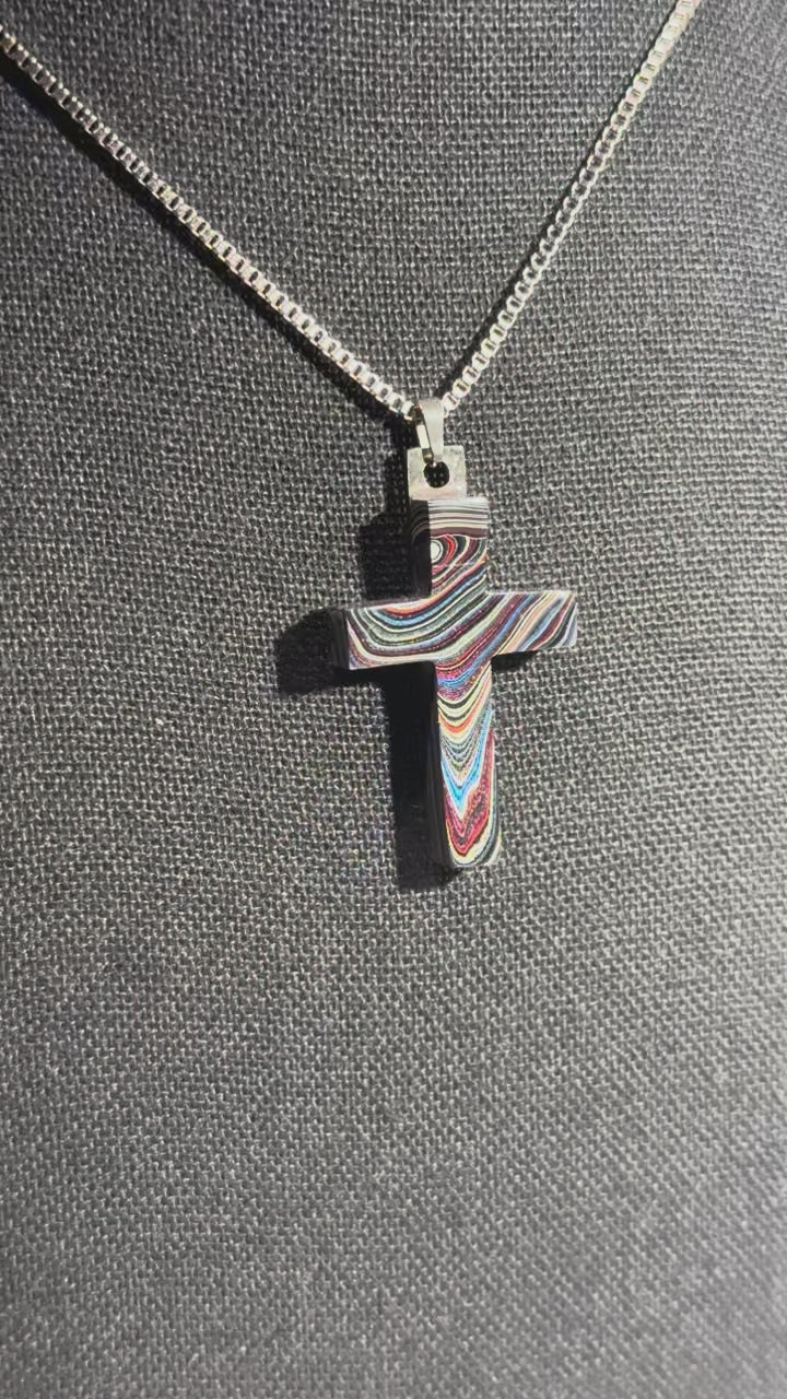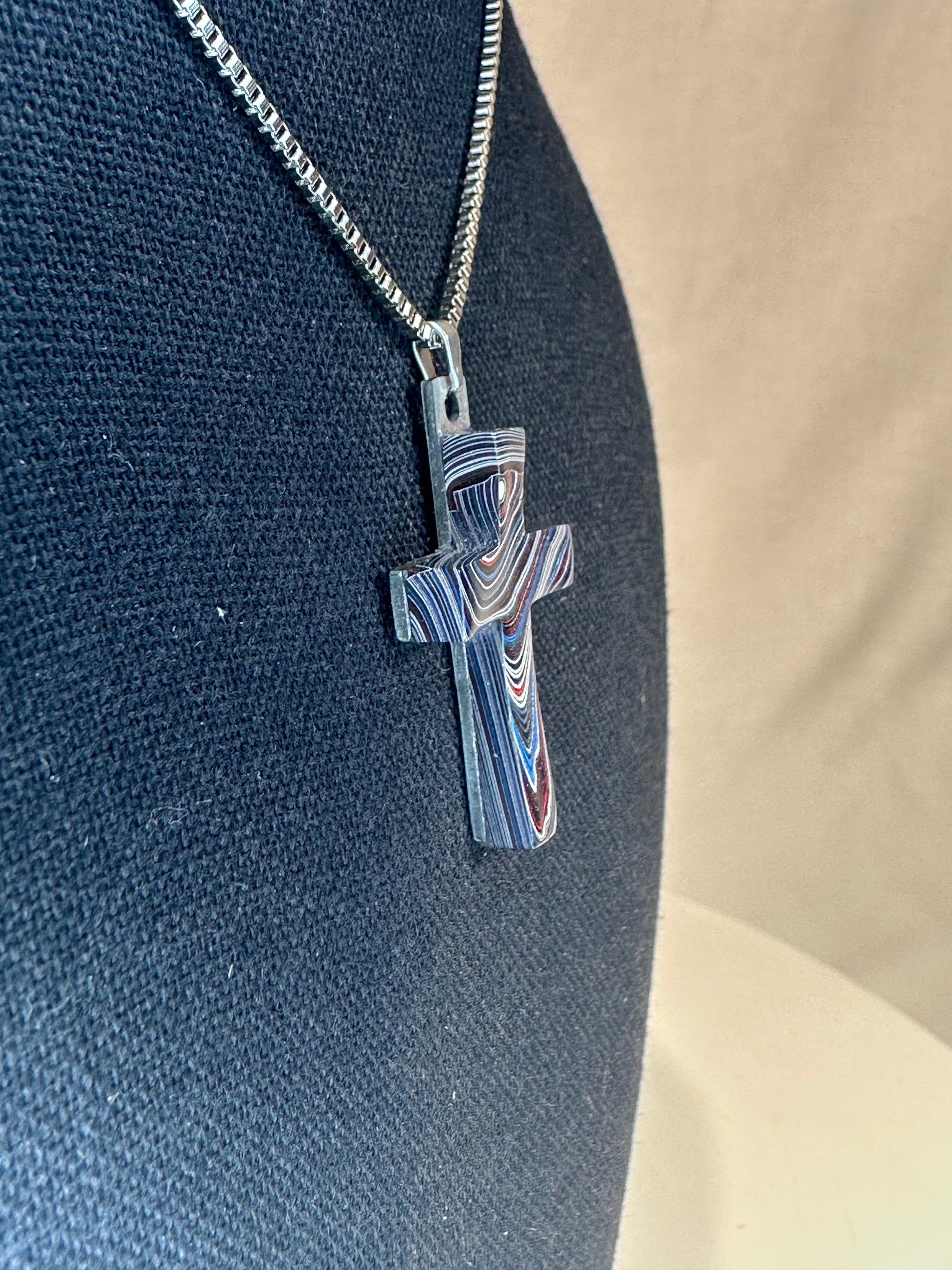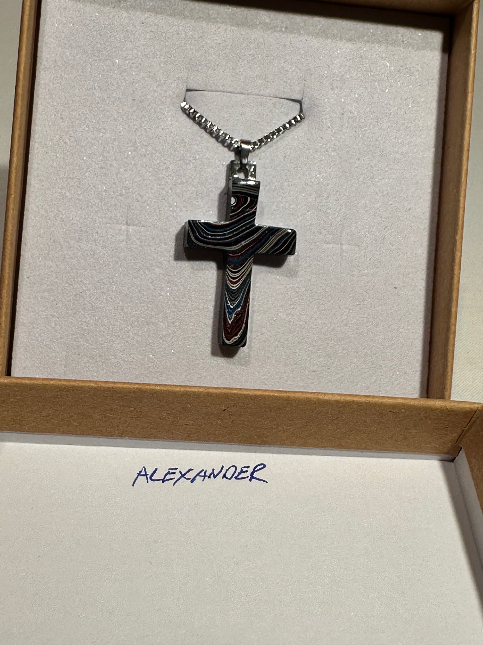 Each cross is handmade in Fort Worth, Texas. Sanded and polished to reveal the specific color bands you see here. Chosen for their texture, balance, and beauty.